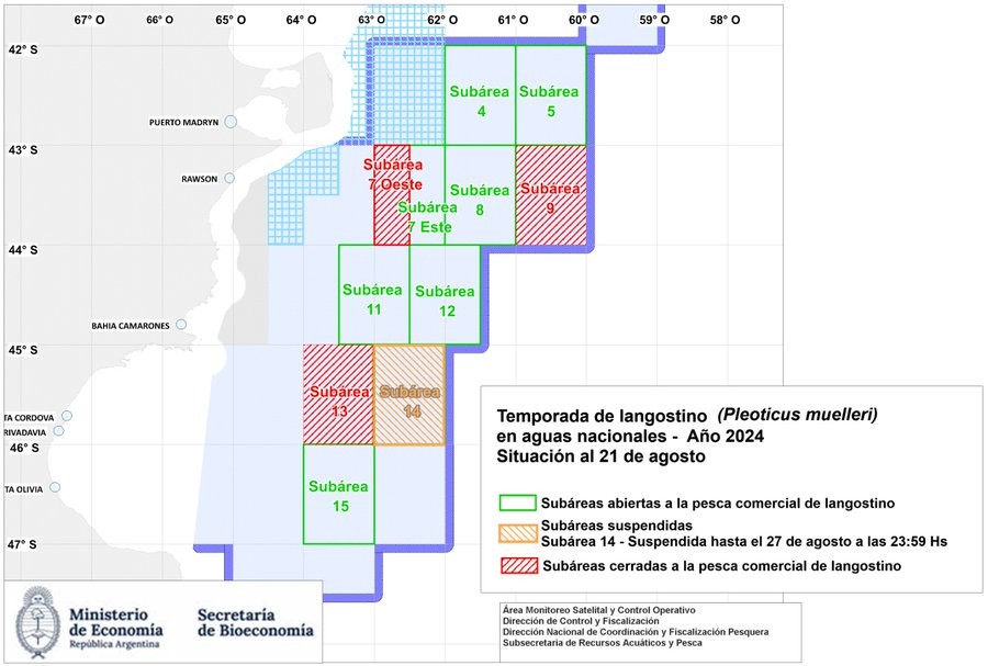 En el mismo sentido, siempre en referencia a la especie langostino, el organismo nacional comunicó que tampoco se autoriza la apertura a la pesca comercial de la sub-área 12, quedan al igual que la nro. 9 sin habilitación para tareas de pesca.
