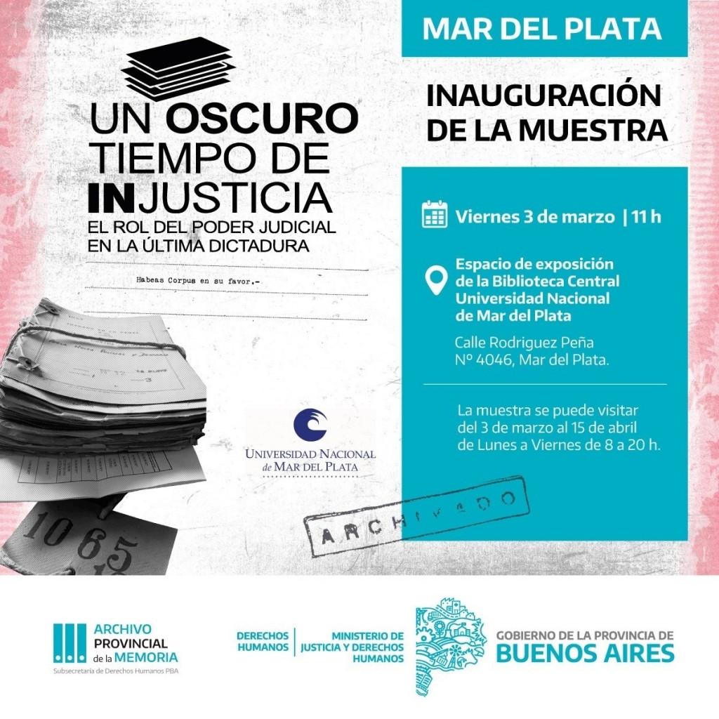 En el marco del Mes de la Memoria, la Verdad y la Justicia, en el que se conmemora el 24 de Marzo a las víctimas de la última dictadura cívico, eclesiástico, militar, el Archivo Provincial de la Memoria dependiente de la Subsecretaría de Derechos Humanos de la Provincia de Buenos Aires presentará en la Biblioteca Central de la Universidad Nacional de Mar del Plata la Muestra Itinerante "Un oscuro tiempo de (in) justicia".