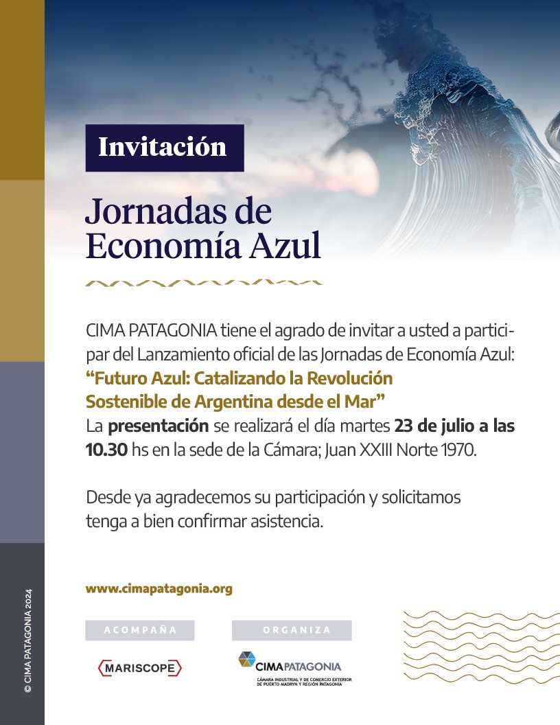 Con la presencia de directivos, asociados, empresarios, autoridades provinciales y municipales, representantes e invitados de distintas instituciones que acompañan esta iniciativa, en la sede de CIMA Patagonia, el martes 23 de julio a las 10,30 se llevará a cabo el lanzamiento de las jornadas de Economía Azul 2024: “Futuro Azul: catalizando la revolución sostenible de Argentina desde el mar”.